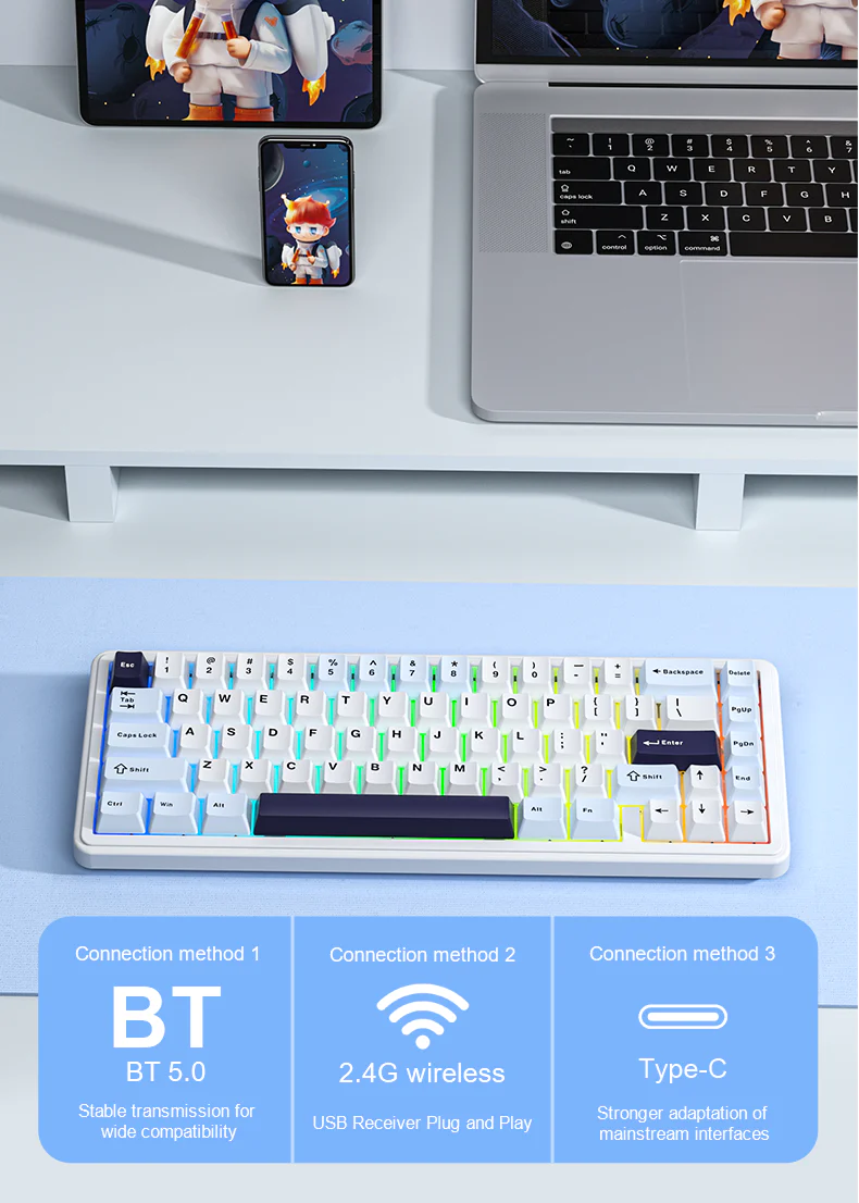 Compact design, limitless possibilities—65 keys, hot-swappable, vibrant RGB, and long-lasting power for your ultimate typing and gaming experience.