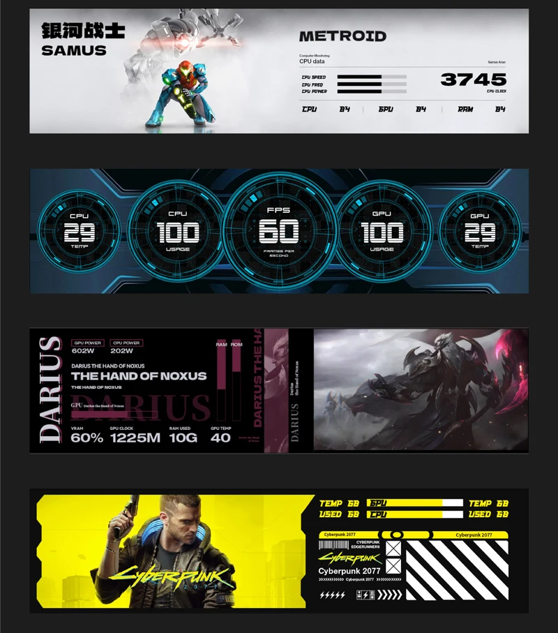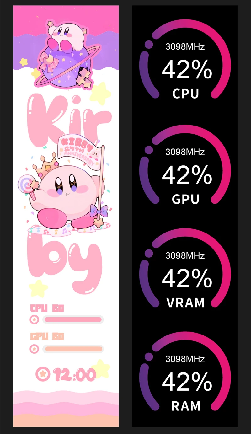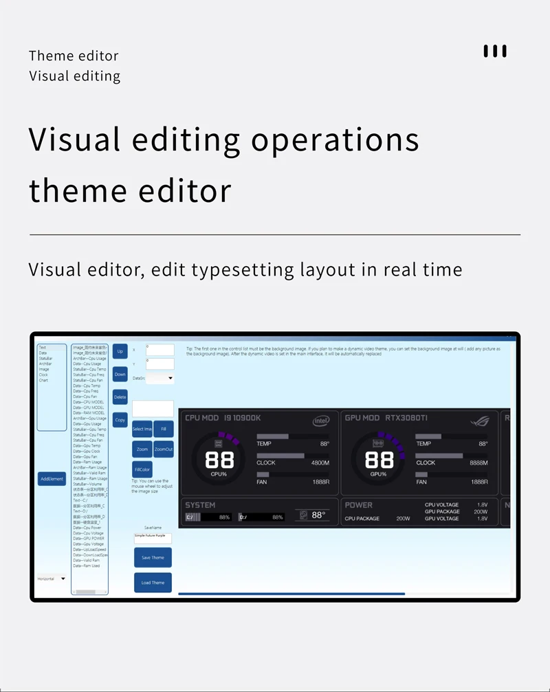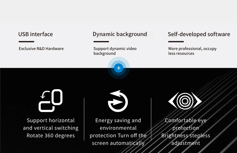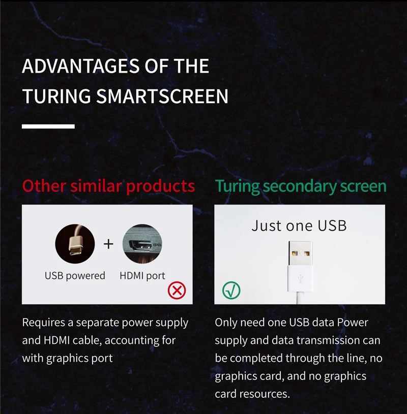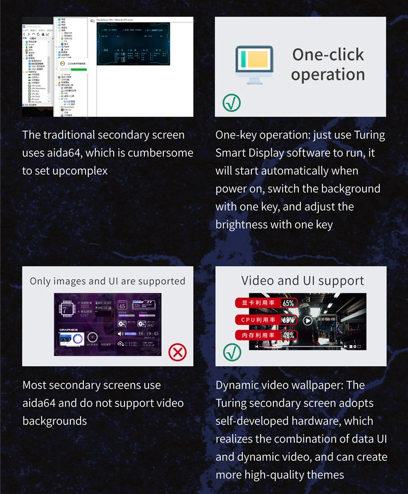 1. Use with self-developed software (TURZX),does not use AIDA64, and takes up less resources, need not HDMI-compatible cable.Support setting dynamic videos as theme backgrounds.