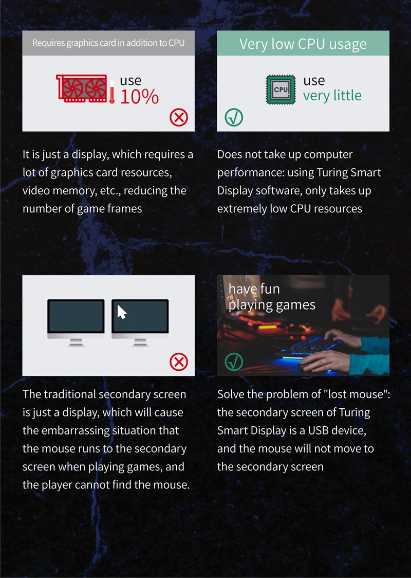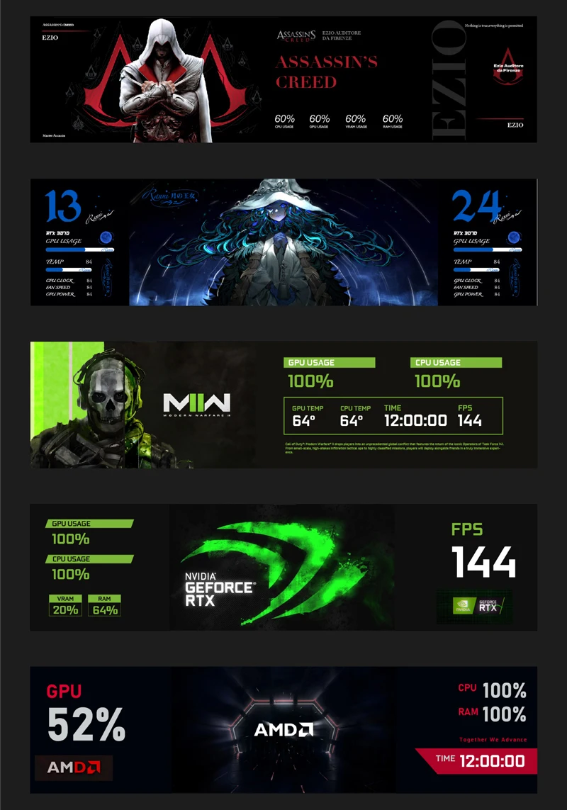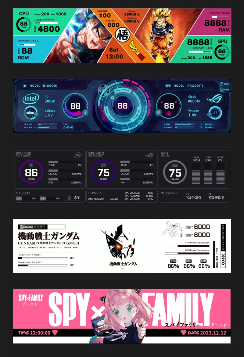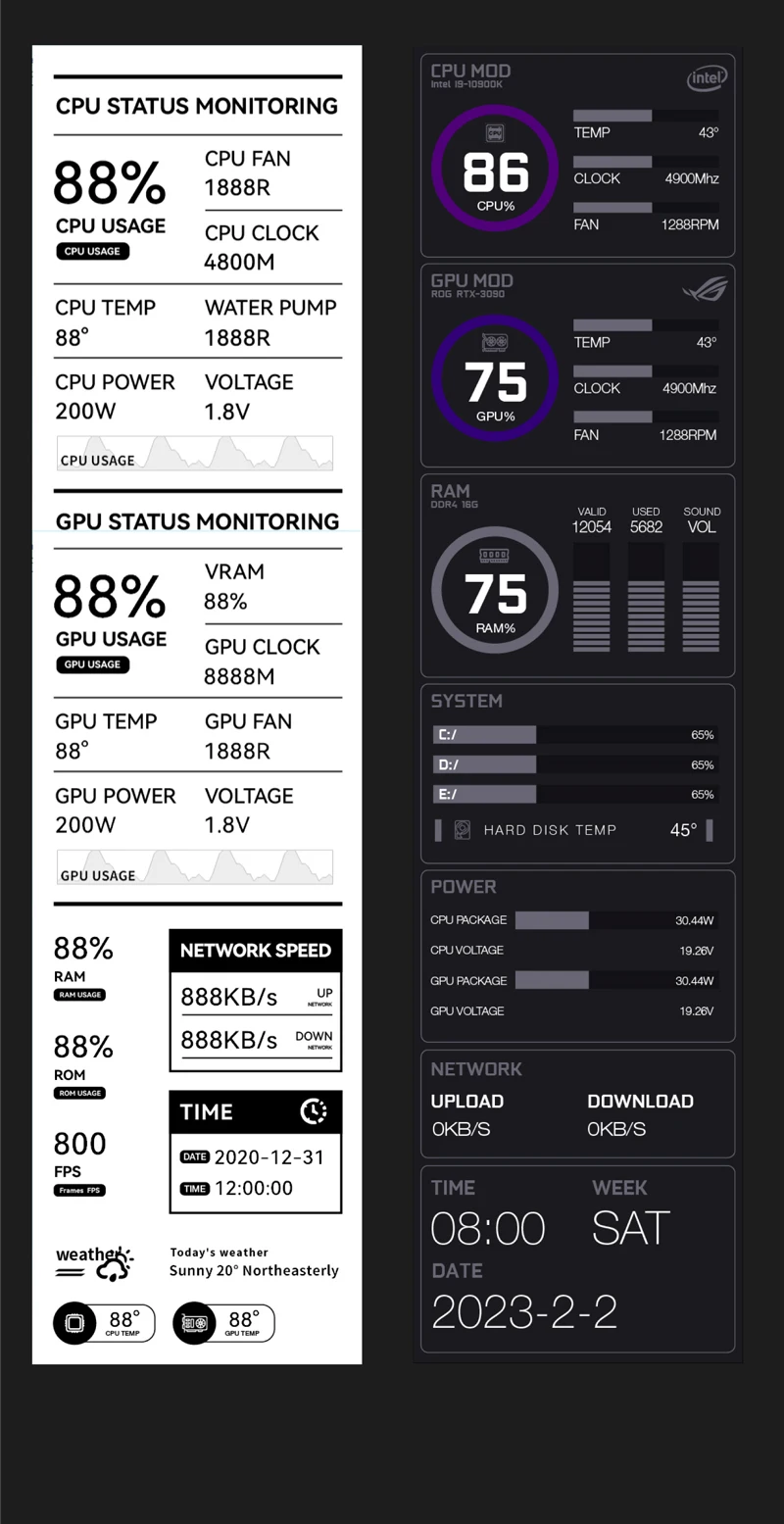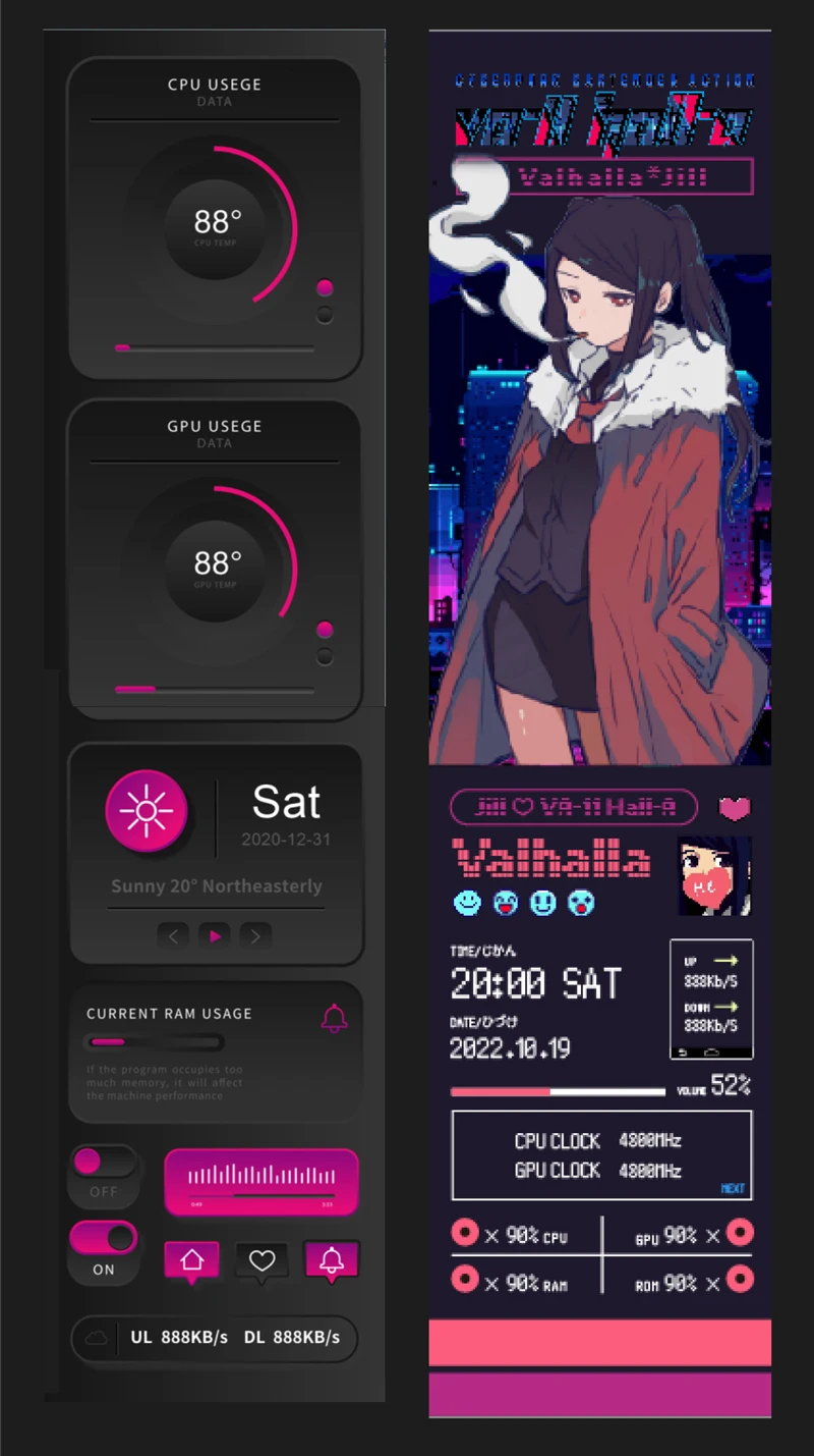 1. Use with self-developed software (TURZX),does not use AIDA64, and takes up less resources, need not HDMI-compatible cable.Support setting dynamic videos as theme backgrounds.